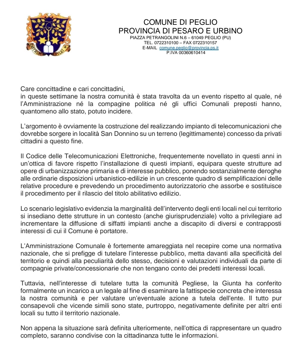 Comunicazione sull'Impianto di Telecomunicazione che Dovrebbe Sorgere in Localitā San Donnino